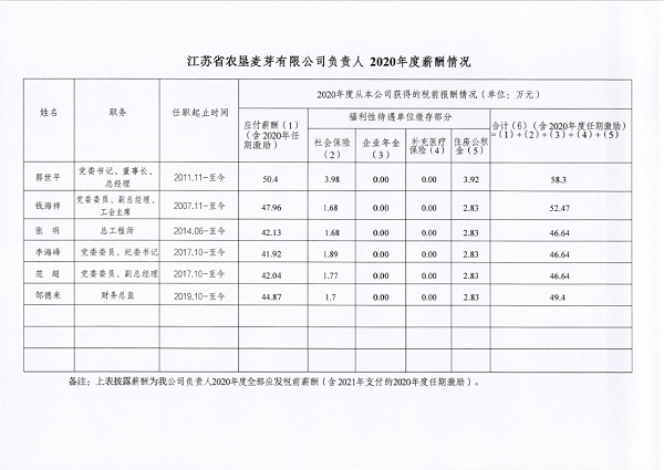 江蘇省農(nóng)墾麥芽有限公司負責(zé)人2020年度薪酬情況