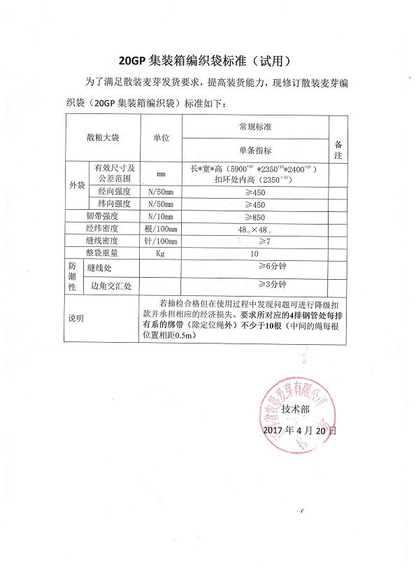 經(jīng)本公司采購招標小組研究決定,本公司2017-2018年度(從2017年4月30日至2018年4月30日)20GP集裝箱袋采購采用競標形式,現(xiàn)將招標文件發(fā)放給貴單位。