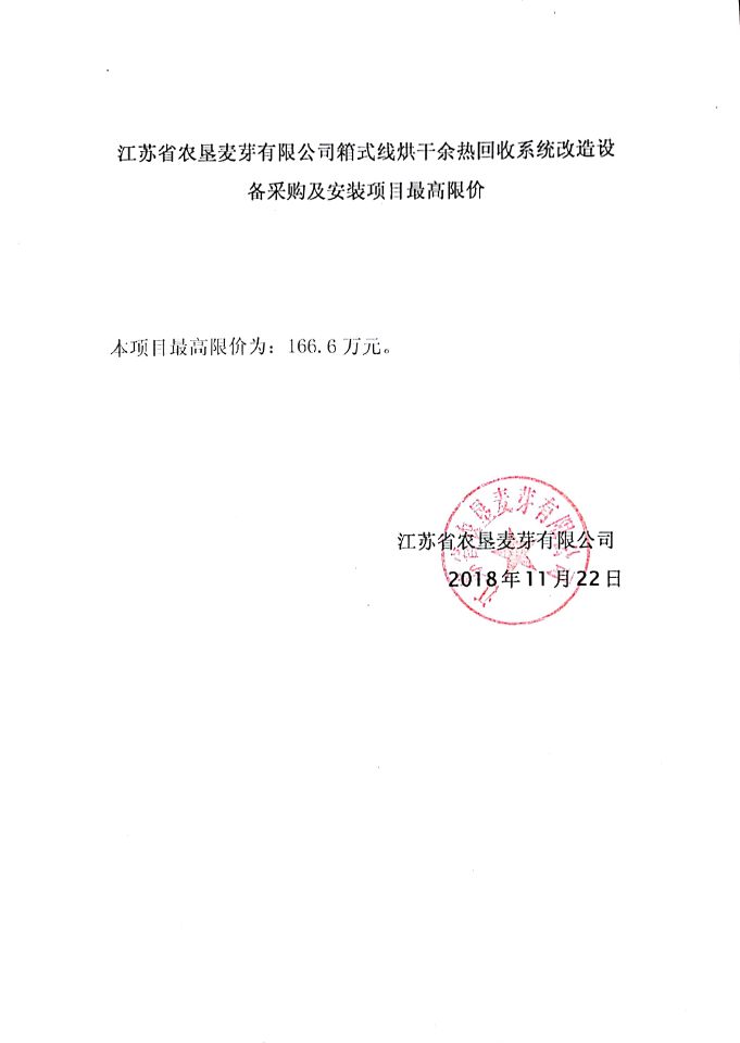江蘇省農(nóng)墾麥芽有限公司箱式線烘干余熱回收系統(tǒng)改造設備采購及安裝項目最高限價