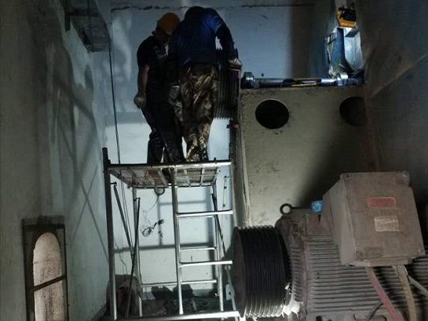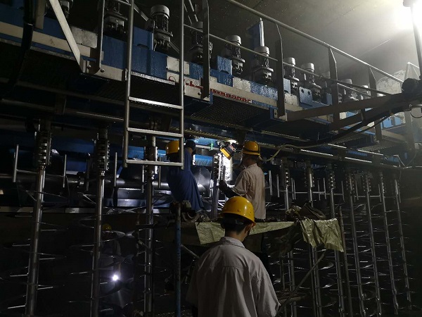 圖為塔式車間維修班組長谷俊先帶領(lǐng)組員錢昭霖、吳海軍、涂可峰對塔式3號芽箱翻麥機組豎絞籠軸承進行檢查和更換。