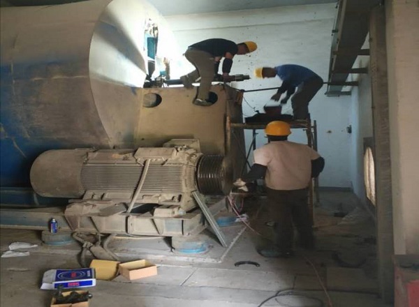 圖為王小軍、姜錚、劉度在4#烘干風(fēng)機室內(nèi)抓緊更換風(fēng)機軸承。