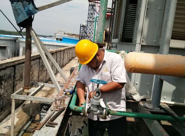 圖為水處理班組組員段紅建檢查更換漏水及銹蝕的閥門。